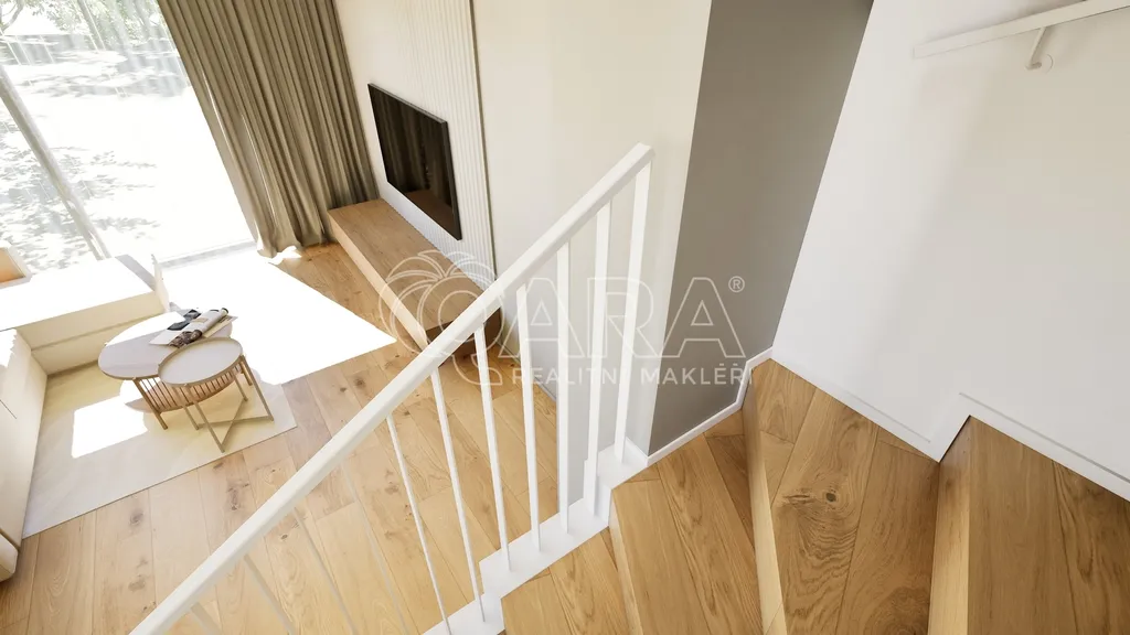 V domě probíhají konečné instalace koupelen, kuchyňské linky včetně spotřebičů, vestavěných skříní, a zároveň zahradní úpravy (terasa, osázení rostlin, zatravnění, zahradní domek), v inzerci jsou použity orientační vizualizace konečného stavu (kromě zařizovacích předmětů).