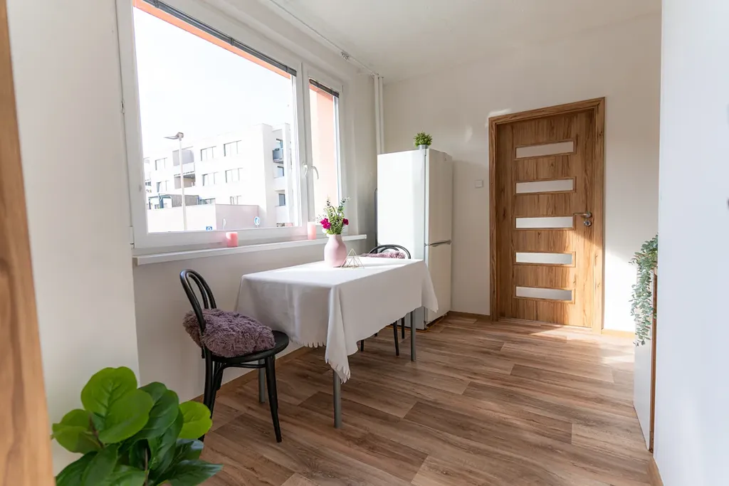 Byt má dva neprůchozí pokoje, což je ideální jak pro jednotlivce, pár, tak i spolubydlení. Orientace oken na západ zajišťuje dostatek přirozeného světla v odpoledních hodinách.