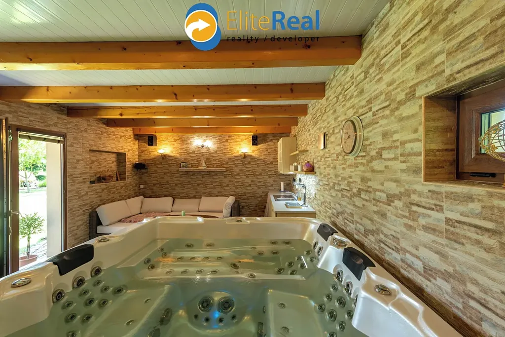 Za domem je vybudovaná okrasná zahrada, včetně zděného grilu s udírnou, zahradního jezírka a kopané studny. V levé části zahrady je příprava na závlahu (nutno zkompletovat). Wellness i závlaha jsou napojeny na studnu.