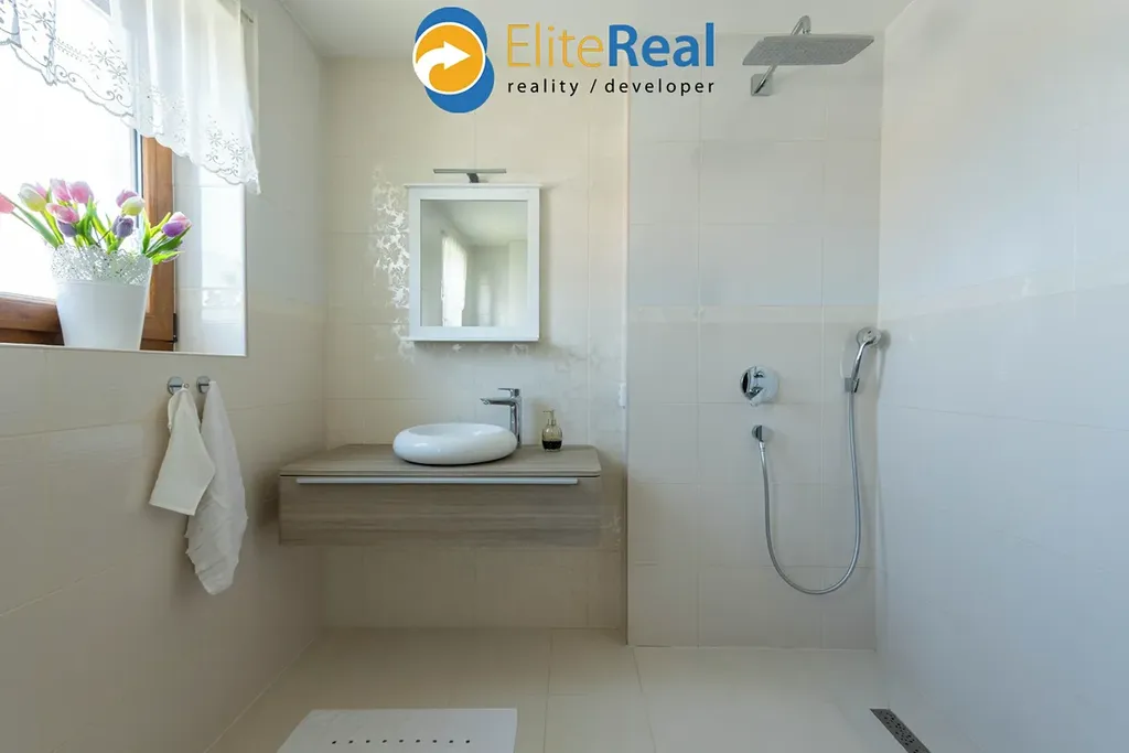 1 NP: předsíň 11 m2, koupelna s vanou a WC 9,5 m2, centrální hala 15 m2, obývací pokoj s kuchyňským koutem 56 m2 (kuchyňská linka je vybavena značkovými spotřebiči) a krbem, vstupem na zastřešenou terasu o výměře 44 m2 (jižní orientace). Dále se v přízemí nachází samostatná bytová jednotka 1+kk se samostatným vstupem, kterou tvoří předsíň 5 m2, samostatné WC/technická místnost 2,5m2, koupelna s vanou 3,5 m2 a obytná místnost s kuchyňským koutem o výměře 36 m2.