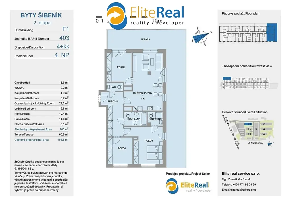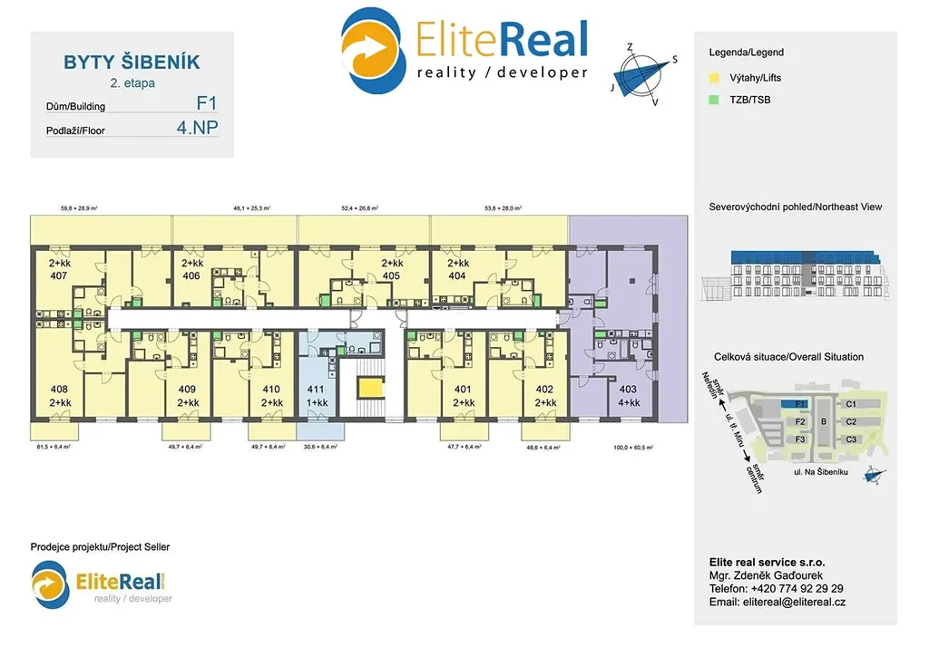 Prodáno 90% bytů. Elite real service s.r.o., prodejce projektu, Vám nabízí prodej nové bytové jednotky přímo v centru města Olomouce v developerském projektu Nový Šibeník 2.etapa (předpokládaný termín dokončení 12/2025). Bytová výstavba je situována v exkluzivní lokalitě přímo v centru města v blízkosti ulice Na Šibeníku v městské části Nová Ulice, Olomouc. Bytová jednotka F1.403 4+kk je orientována na severovýchod a jihozápad. Plocha jednotky 98,4 m2 + plocha terasy 60,00 m2. Zajistíme Vám bezplatně financování nemovitosti. Nabízíme klientům služby vlastního hypotečního centra s výhodami, které jsme pro Vás s bankovními ústavy připravily. Kupte si nové nízkonákladové bydlení - bytový dům je zařazen do energetické třídy B. Půdorys bytové jednotky, který zde prezentujeme, je základní. Dispozici nové jednotky a design si můžete upravit dle vlastních požadavků. Jednotky je možné slučovat i rozdělovat dle fáze výstavby. Nechte si postavit nový byt dle vašich představ. K novému bytu je možno dokoupit sklep nebo vnitřní parkovací stání. Standardní vybavení bytů splňuje požadavky moderního bydlení (keramická podlaha, obložkové zárubně, moderní keramické obklady, francouzské okna, atd.). Klientům nabízíme možnost kompletního návrhu a řešení interiéru. Výjimečná investiční příležitost koupě nového bytu přímo v centru města u tramvajové zastávky s docházkovou vzdáleností 7 minut pěšky do historického centra. Pro investory zajišťujeme bezplatně následný pronájem, případně i správu nemovitosti. Doporučujeme osobní jednání a prohlídku výstavby - volejte makléře. Bližší informace k bytovému projektu a největší nabídku novostaveb - nových bytů, bytů na prodej, bytů k pronájmu - naleznete na našich webových stránkách.