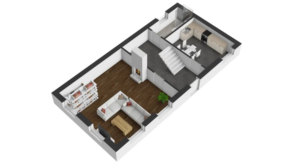 V přízemí se nachází vstupní chodba se schodištěm do patra. Levá část domu nabízí prostorný obývací pokoj propojený s ložnicí, dále samostatnou kuchyni s kuchyňskou linkou a spotřebiči a koupelnu s vanou a WC.