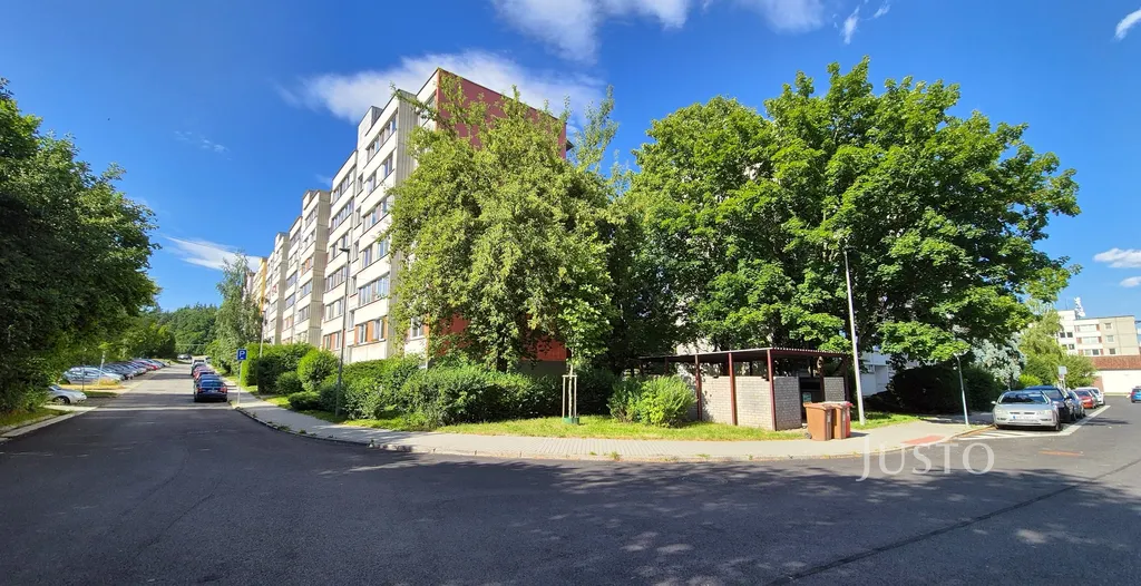 Okna bytu směřují do vnitrobloku sídliště, který je osázen zelení, parkování přímo u domu.