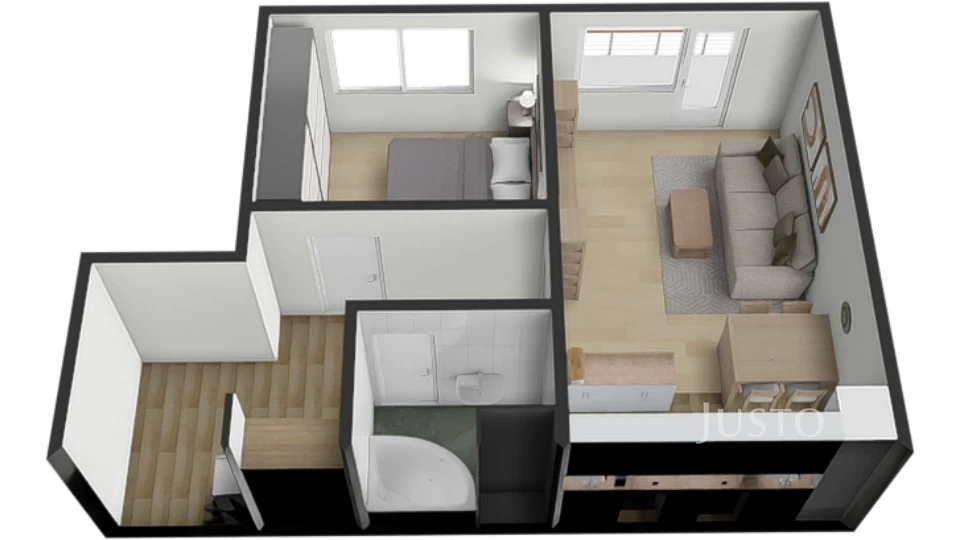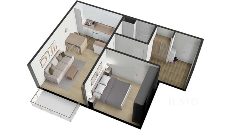 Dispozice bytu: obývací pokoj s kuchyňským koutem a vstupem na balkon, ložnice, vstupní předsíň s úložnými prostory, zděná koupelna s vanou a toaletou.