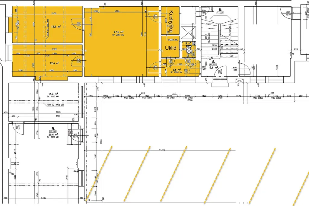 Ke kanceláři je možnost pronajmout parkovací stání na dvoře za 2.500 Kč/měs. a sklepní koj (4 m2) za 500 Kč/měs.