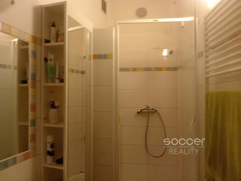 Koupelna je vybavena sprchovým koutem a pračkou. WC je samostatné.