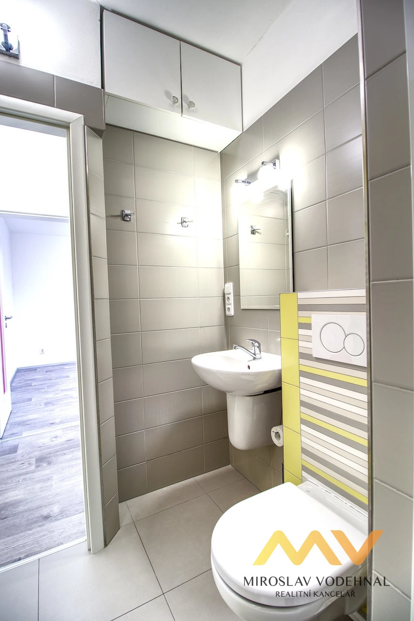 Koupelna je se sprchovým koutem, umyvadlem se zrcadlem a toaletou. Na předsíň navazuje otevřený prostor, který je ideální jako šatna, komora nebo úložný prostor. K bytu náleží sklepní kóje v suterénu domu a v mezipatře lodžie o velikosti 4 m² určena pouze pro tento byt.