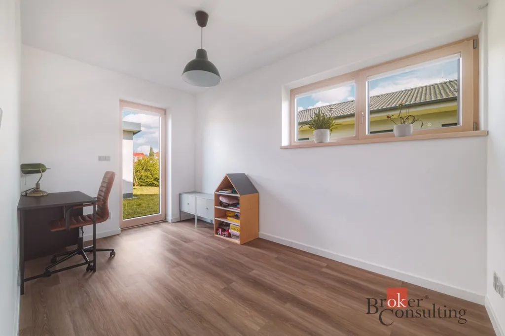 Interiér domu je navržen s důrazem na prostor a dostatek soukromí pro všechny členy domácnosti díky rozloze 135 m². Srdcem celého domova je velkorysý obývací pokoj s jídelnou a moderní kuchyní vybavenou kvalitními spotřebiči, mezi které patří například americká lednice, myčka nádobí a vestavná trouba. Vysoký standard bydlení doplňují vestavěné skříně a další doplňky na míru, které zajišťují dostatek úložných prostor pro zachování čistého designu. Z hlavního obytného prostoru lze vstoupit přímo na venkovní terasu. Dispozice dále zahrnuje ložnici, dva dětské pokoje a samostatnou pracovnu. Praktickou stránku bydlení zajišťují dvě koupelny, prostorná předsíň a technická místnost. O tepelný komfort v celém domě se stará podlahové vytápění a pro budoucí majitele je zde již připraven kompletní systém pro instalaci kamerového zabezpečení.