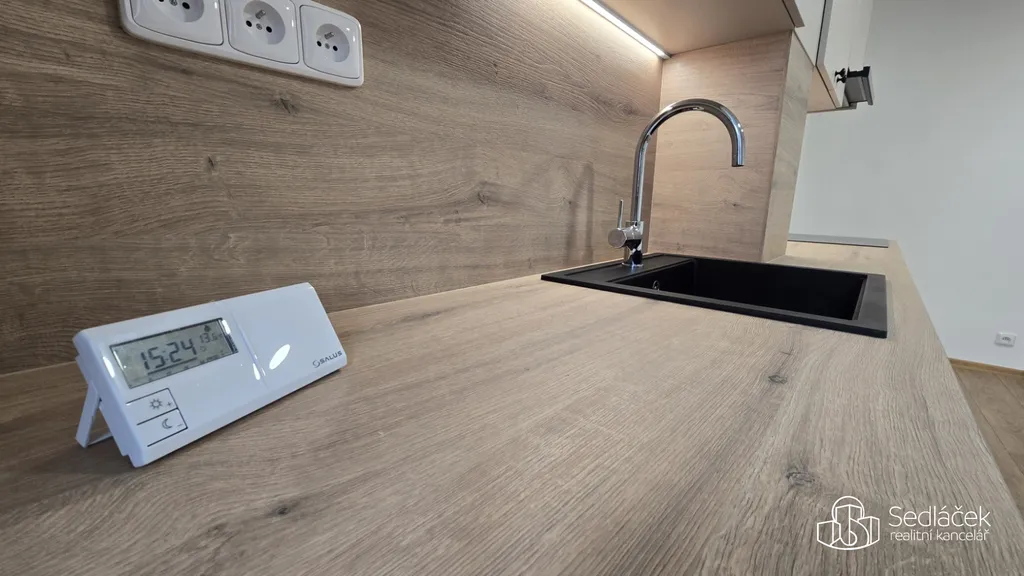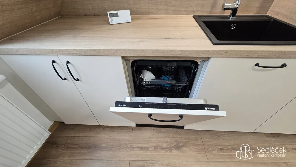 Byt je prakticky řešený – nabízí kuchyň vybavenou kvalitními spotřebiči spojenou s jídelnou a zajímavý prostor pro obývací pokoj s ložnicí, Koupelna disponuje sprchovým koutem. V celém bytě jsou laminátové podlahy, které působí elegantně a snadno se udržují.
