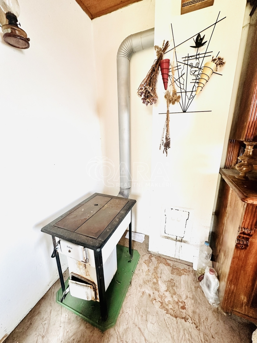 V přízemí se nachází obytná místnost s lokálními kamny a další pokoj lze vybudovat v podkroví.