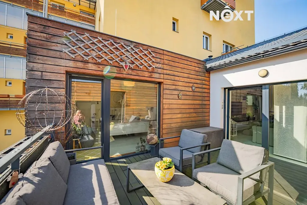 Velkou přidanou hodnotou bytu jsou dvě prostorné terasy, které dodávají bydlení jedinečný charakter. U vstupu do bytu se nachází terasa o velikosti 42 m², která vytváří příjemný a reprezentativní vstup do domova a umocňuje pocit bydlení v rodinném domě. Druhá terasa o velikosti 15,5 m² je přístupná ze tří místností a nabízí dostatek soukromí – ideální místo pro ranní kávu, večerní sklenku vína nebo klidný odpočinek.