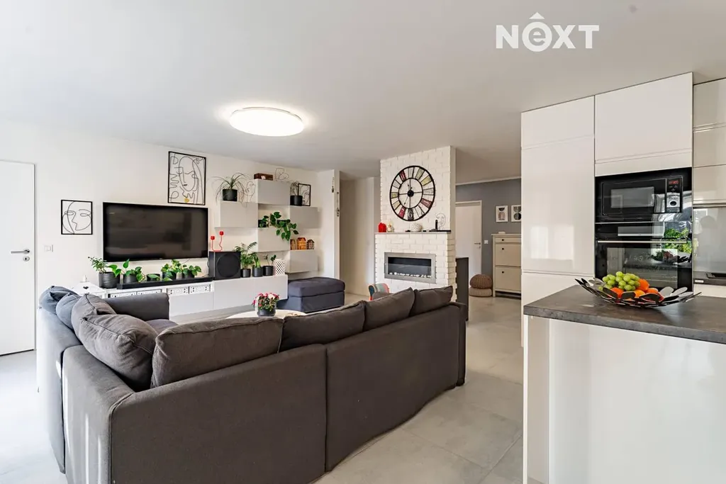 Dominantou bytu je velkorysý otevřený prostor obývacího pokoje s moderní kuchyňskou linkou a vestavěnými spotřebiči, který přirozeně propojuje kuchyň, jídelní část i obývací zónu. Celý prostor působí velmi vzdušně a nabízí dostatek místa pro rodinný život i setkávání s přáteli.