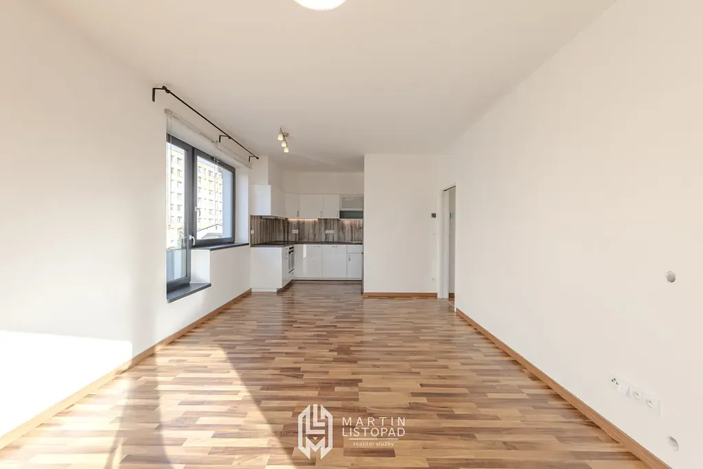 Dominantou bytu je prostorný obývací pokoj s kuchyňským koutem, ze kterého je vstup na balkon. Ten je přístupný také z ložnice, což vytváří propojení obou místností s venkovním