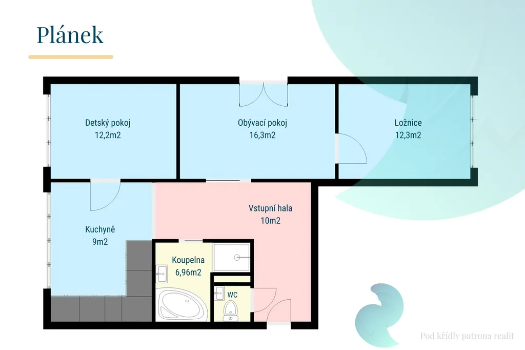 Dispozice bytu je velmi prakticky řešena - z velkorysé vstupní haly (10 m²) vcházíme do obývacího pokoje (16,3 m²) s velkým francouzským oknem, ze kterého je nádherný výhled. Obývací pokoj sousedí s jednou z ložnic (12,3 m²), druhá ložnice/dětský pokoj (12,2 m²) se nachází vedle kuchyně (9 m²). V bytě je krásná koupelna a samostatné WC. Byt je orientován na tři světové strany, což zajišťuje dostatek denního světla po celý den.