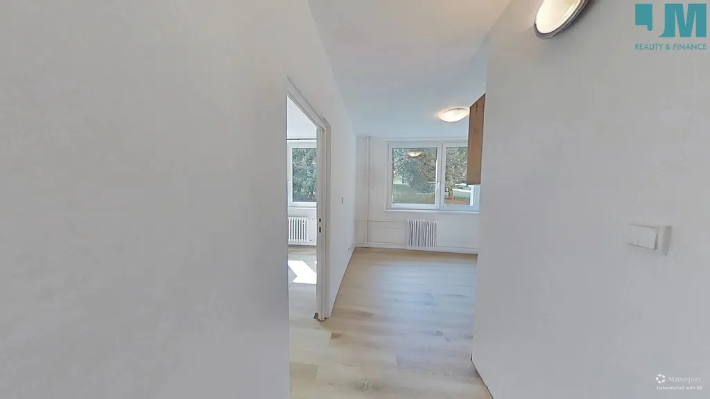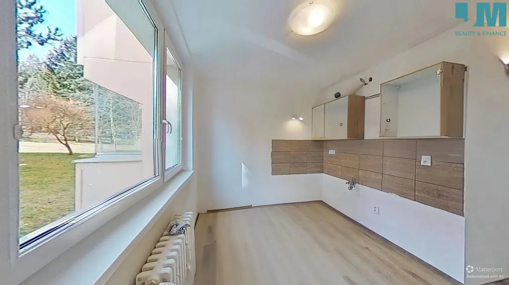 Dispozice bytu nabízí samostatný pokoj a oddělenou kuchyni, což zajišťuje dostatek soukromí i pohodlí. Interiér působí vzdušně díky světlým vinylovým podlahám a neutrálním barvám, které si snadno přizpůsobíte podle vlastního stylu.