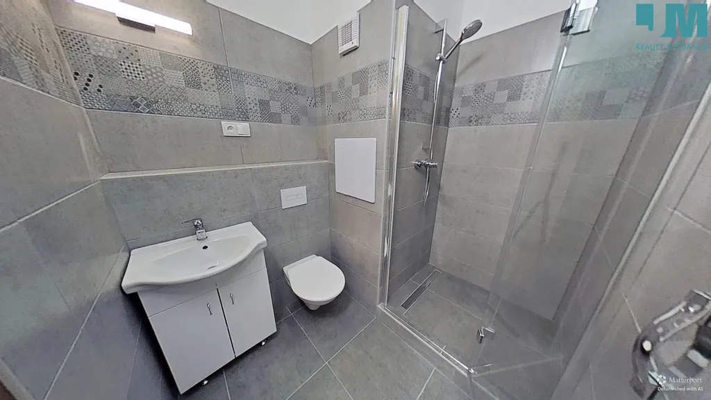 Koupelna je řešena v moderním designu a nabízí prostorný sprchový kout, umyvadlo se skříňkou a vestavnou toaletu – ideální kombinace funkčnosti a elegance.