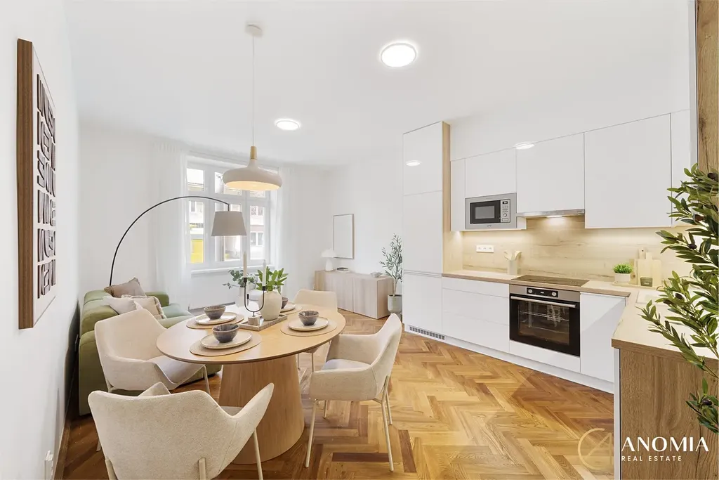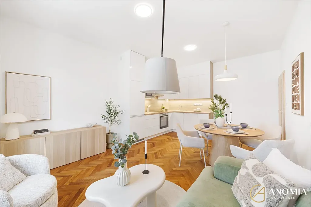 Celkový charakter bytu podtrhují vysoké stropy a renovované jasanové parkety, které dodávají interiéru eleganci a osobitost. V dalších částech bytu je položena kvalitní zátěžová vinylová podlaha, jejiž dekor je sladěný se zbytkem interiéru. Byt dále nabízí dva samostatné neprůchozí pokoje, které lze využít jako ložnici, dětský pokoj nebo pracovnu. Koupelna s walk-in sprchovým koutem, dvoj umyvadlem a led zrcadlem je provedena v nadčasovém stylu s důrazem na praktičnost. Komfort v koupelně zajišťuje elektrické podlahové vytápění a otopný žebřík. Na koupelnu navazuje technická místnost.