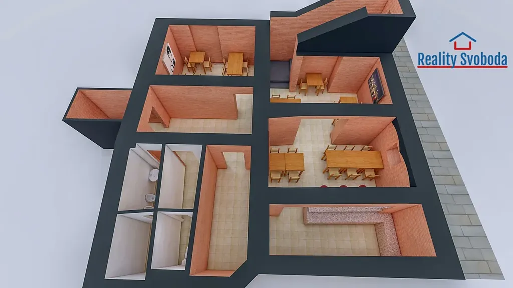 Momentálně jsou prostory v procesu rekonstrukce a další úpravy budou probíhat po dohodě s budoucím nájemníkem, podle toho, jaké bude zaměření činnosti. Přiložené obrázky slouží jako ukázka toho, jak by mohl prostor vypadat.