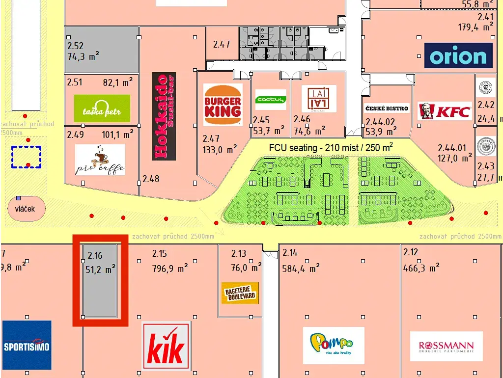 Nabízená jednotka je ve foodcourte, je ve stavu shell & core a je možné jednat o kontribuci na stavební práce, fit-out apod.