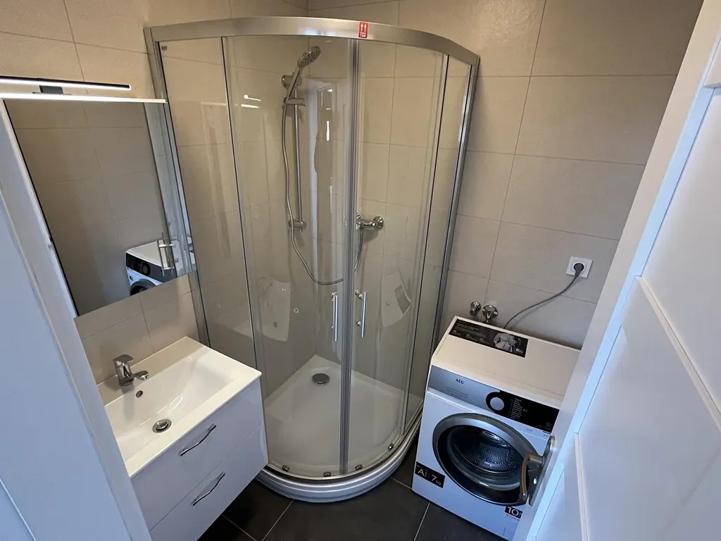 koupelny - je sice malá, ale najdete v ní to, co je třeba - sprchový kout, pračku zn. AEG, otopný el. žebřík černé barvy a samozřejmě umyvadlo s podumyvadlovou skříňkou a zrcadlem na stěně.