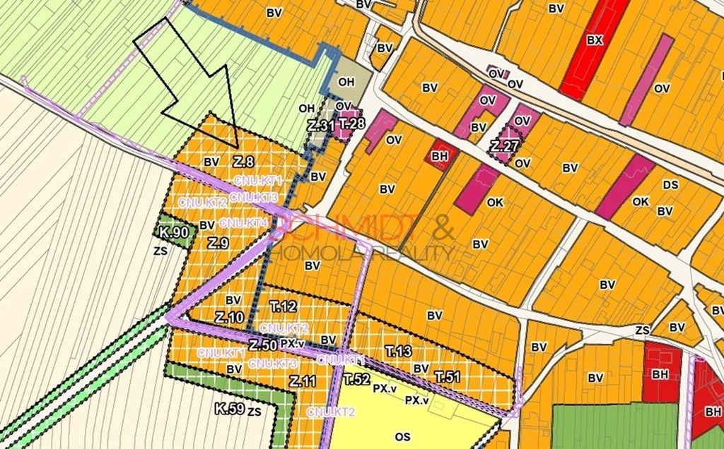Nabízíme k prodeji mírně svažitý stavební pozemek o výměře 603 m² s krásným výhledem na Pálavu a Nové Mlýny na ulici Strachotínská v obci Šakvice. Jedná se o lokalitu, kde právě probíhá výstavba inženýrských sítí. Dle připravované změny územního plánu zveřejněné dne 13.3.2026 je parcela určena k bydlení a zařazena do ploch BV – bydlení venkovské, jež stanovuje jednopodlažní objekty s obytným podkrovím, zastřešení sedlovou, valbovou nebo polovalbovou střechou. Uliční šíře parcely činí 11 a délka téměř 55 metrů.