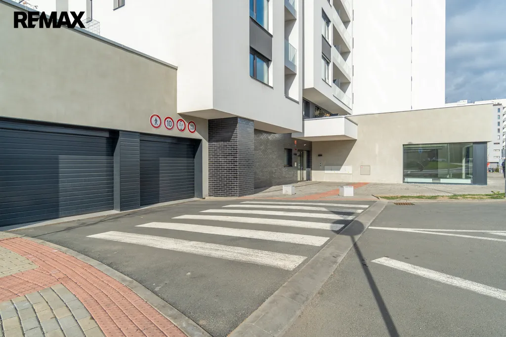 Vjezd do garáže je přes automatická vrata na dálkové ovládání, přístup mají pouze vlastníci a nájemci objektu.