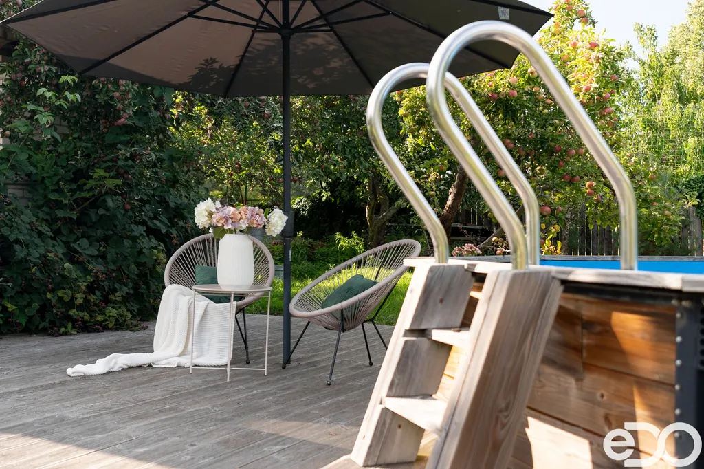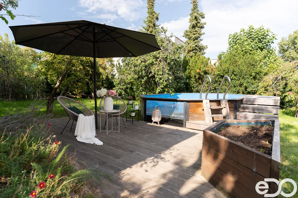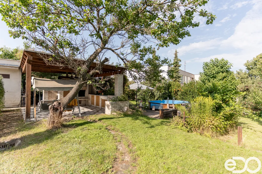 Zahrada je osázena vzrostlými stromy a nabízí bohatou úrodu – k dispozici jsou jabloně, broskvoně i keře s malinami a ostružinami. Součástí je také pergola pro příjemné posezení a bazén, který oceníte zejména v letních měsících.