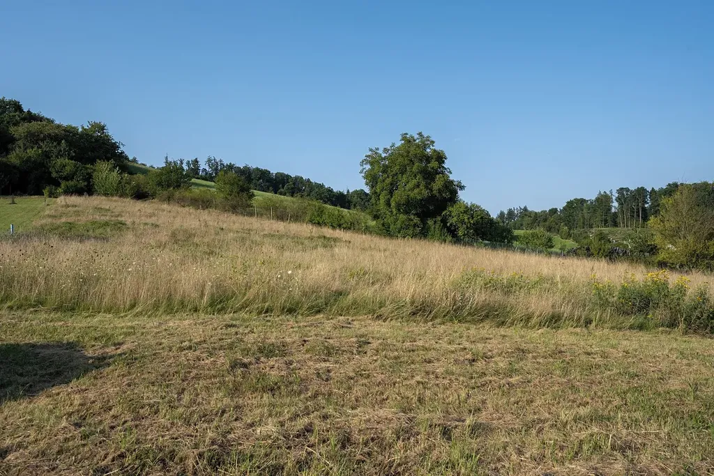Pozemek se nachází na krásném vyvýšeném místě nad obcí s výhledem do okolní přírody.