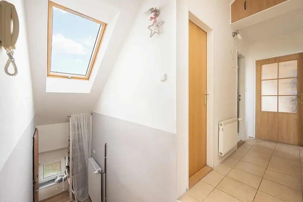 Hlavními designovými prvky v interiéru jsou krásné dřevěné nosné trámy. Vstupní chodba bytu je ozvláštněna krátkým schodištěm. Celý prostor je chodby působí velmi vzdušně a světle. V bytě je spousta úložných prostor a vestavěných skříní.