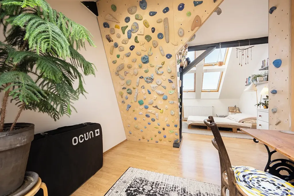 Byt má dispozici 3+kk, podlahovou plochu 91 m2 a náleží k němu sklep. Je umístěn na 4. podlaží cihlového domu ve střešní nástavbě. Předmětem prodeje není nábytek, vyjma kuchyňské linky.