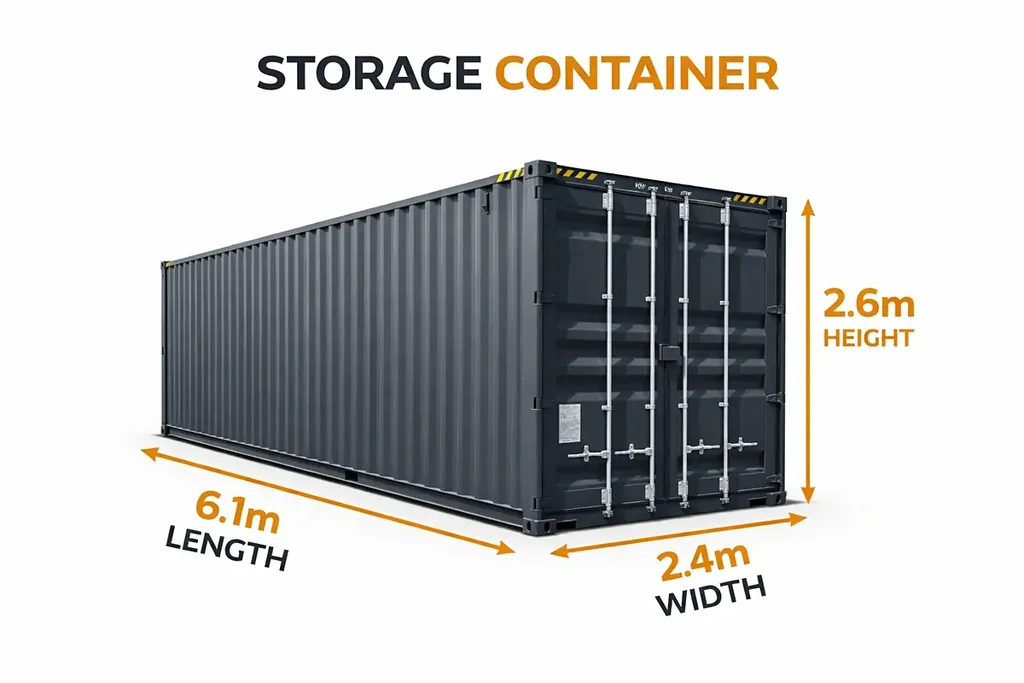 Nabízíme k pronájmu skladový kontejner o ploše cca 15 m² a rozměrech (š) 2,438 m × (v) 2,591 m × (d) 6,058 m.