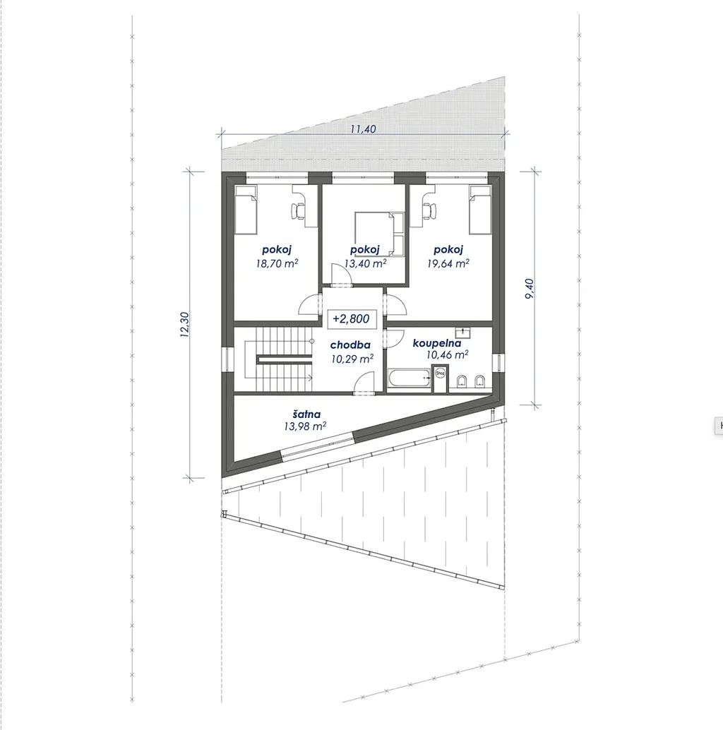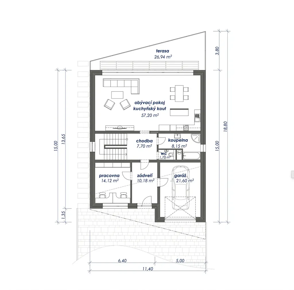 půdorys cca 11,4 × 18,8 m.