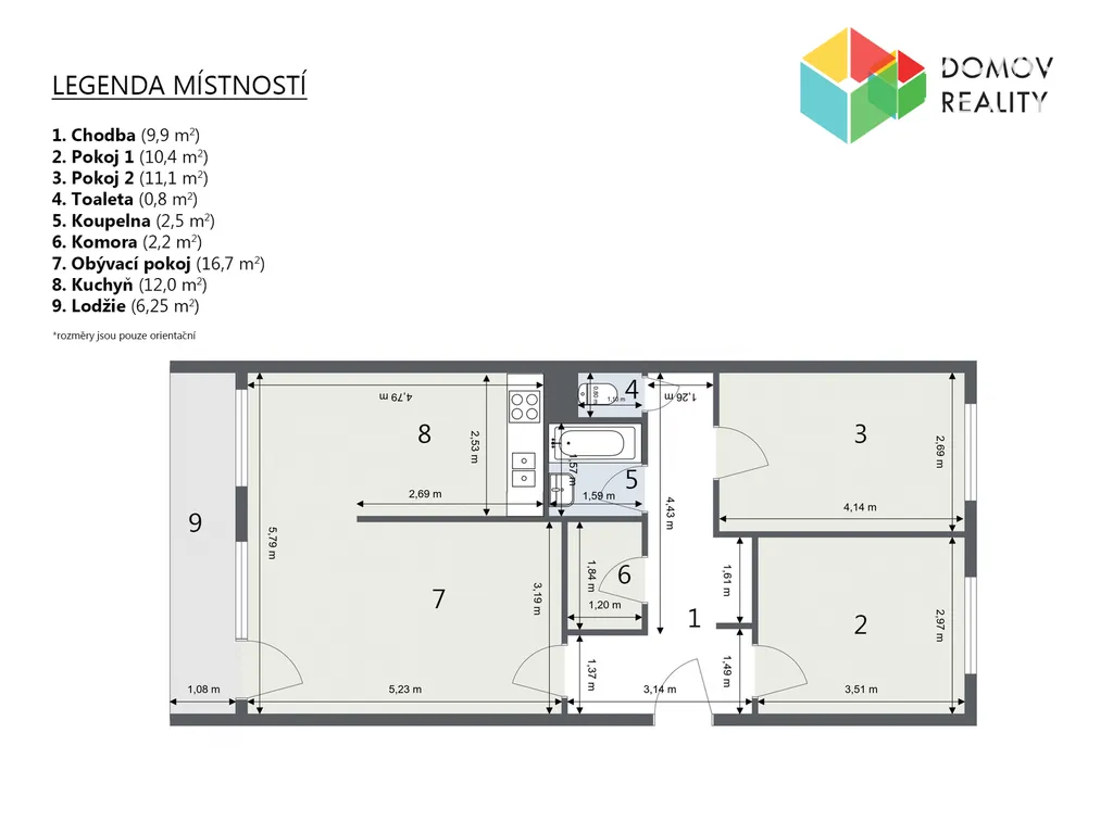Dispozice bytu umožňuje variabilní úpravy – nabízí se přetvoření na světlé 3+kk s otevřeným obývacím prostorem a kuchyňským koutem. Celková užitná plocha bytu činí 68,6 m², k tomu prostorná lodžie o velikosti 7,5 m² a sklep o výměře 2,4 m².