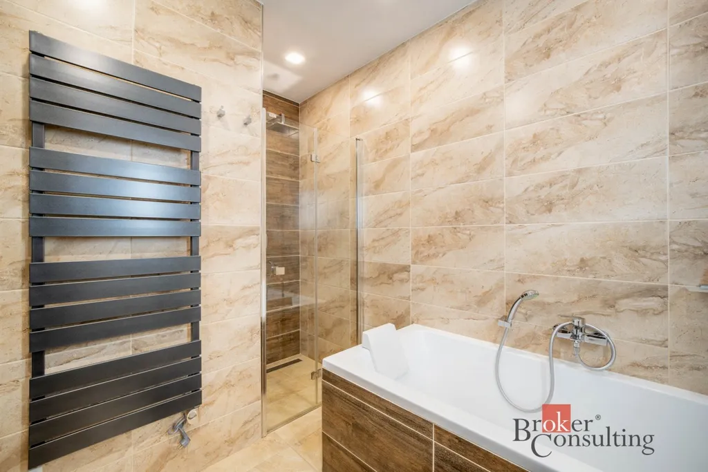 Dominantou bytu je světlý obývací prostor plynule navazující na moderní kuchyni, která je navržena s důrazem na detail, funkčnost i estetiku. Kuchyň je vybavena kvalitními spotřebiči včetně parní trouby a součástí jejího řešení je i elegantně zabudovaná vinotéka, která podtrhuje její nadstandardní provedení.