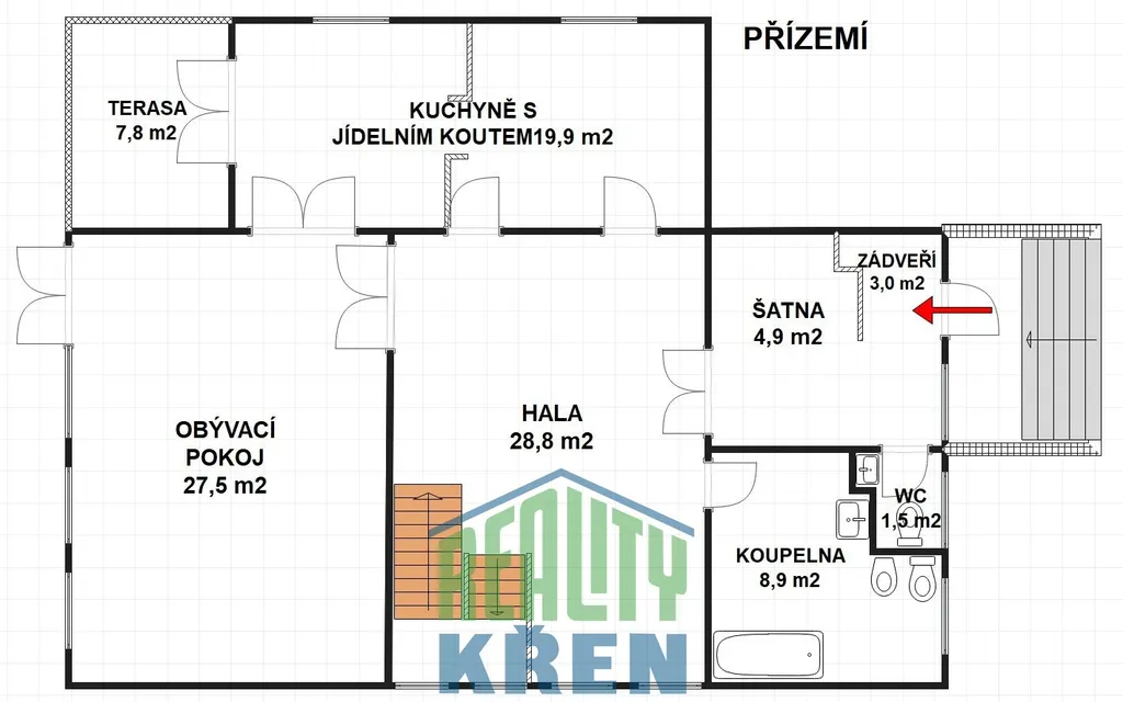1. NP: zádveří 3 m2, předsíň 4,9 m2, hala 28,8 m2, kuchyně s jídelnou 19,9 m2, obývací pokoj 27,5 m2, koupelna s WC 8,9 m2, WC 1,5 m2, venkovní terasa 7,8 m2;