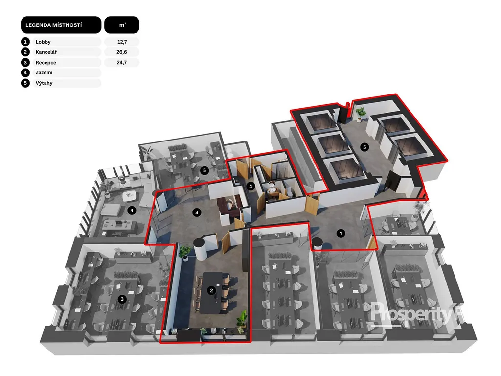 Každá kancelář je plně klimatizovaná, vybavená žaluziemi a vstup je zajištěn přes čipovou kartu.