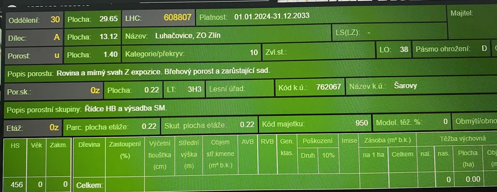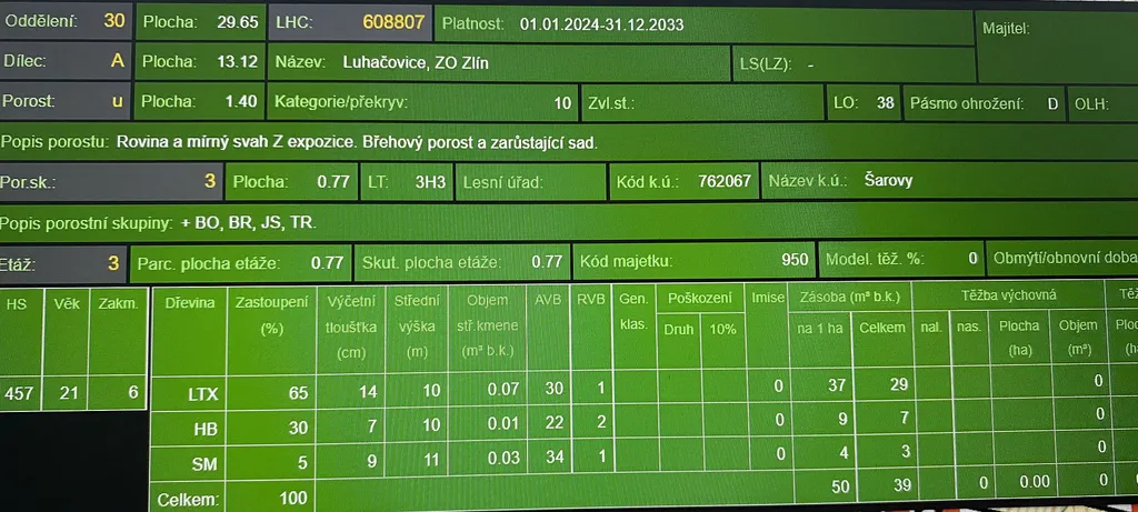 Prodej lesního pozemku v katastrálním území Šarovy, okr. Zlín. Jedná se o pozemek p.č. 778 o výměře 11.619 m². Pozemek se nachází na rovině až mírně svažitém terénu s přístupem po katastrované nezpevněné komunikaci ve vlastnictví státu a obce. Na ploše pozemku se nachází dle platných LHO v největší míře lesní porost habru, borovice, břízy, smrku, jasanu a ostatních listnatých tvrdých dřevin ve věku 22 let, dále pak lesní porost habru, borovice, smrku, javoru a ostatních tvrdých listnatých dřevin ve věku 42 let. Pozemek je vhodný pro stavbu účelového zařízení sloužící lesu a zvěři ( posed, krmelec, chatka atd. ). Informace na tel. nebo e-mailu.