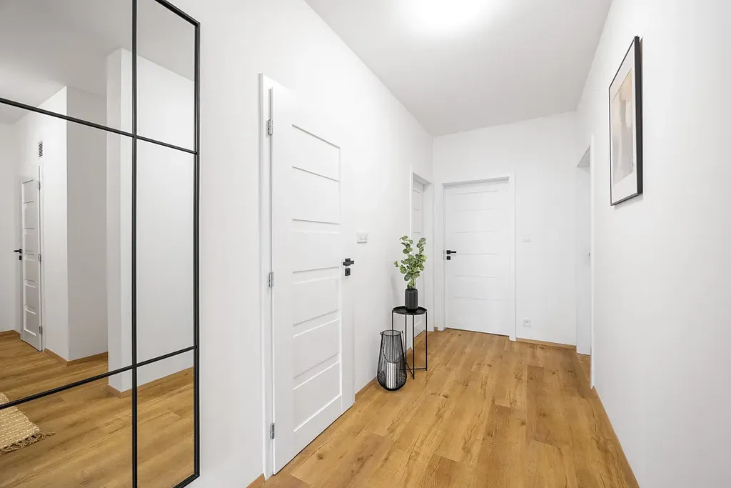 Byt vypadá přesně jak vidíte na fotografiích, nejedná se o vizualizaci. Kuchyně je vyrobena na míru a kompletně vybavená spotřebiči (elektrická trouba, mikrovlnná trouba, indukční deska, myčka). Kuchyně je velkorysá s důrazem na dostatek úložných prostor a pohodlí při každodenním využívání. Velký obývací pokoj s kuchyní do L je dominantou tohoto bytu. Garážové stání se pak nachází jen pár kroků od výtahu.