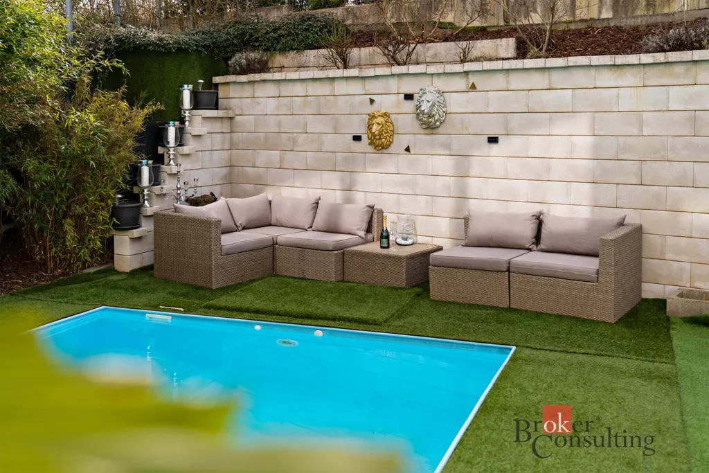 Velkým benefitem této nemovitosti je soukromá zahrada, která vytváří ideální zázemí pro rodinný život i relaxaci. Najdete zde bazén s protiproudem pro každodenní odpočinek i aktivní využití a díky přímému vstupu ze všech obytných místností působí zahrada jako přirozené rozšíření interiéru. Celý prostor tak nabízí příjemné soukromí a komfort, který běžné byty jen zřídka poskytují. Součástí zahrady je také vyvýšená terasa s příjemným výhledem na okolí Plzně. Tento prostor je ideální pro relaxaci, večerní posezení nebo ranní kávu – oddělený od hlavní části zahrady, a přesto s ní propojený.