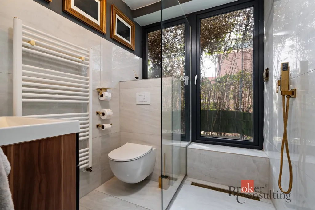 Dispozice je navržena s důrazem na praktičnost i každodenní komfort. Dominantou bytu je prostorný obývací pokoj s kuchyňským koutem a jídelní částí, ze kterého je přímý vstup na terasu. Tento prostor přirozeně navazuje na zahradu a tvoří srdce celého bydlení. Byt dále nabízí čtyři samostatné pokoje, které umožňují flexibilní využití – ložnice, dětské pokoje, pracovna či pokoj pro hosty. Hlavní ložnice disponuje šatním prostorem a poskytuje dostatek soukromí. Velkoformátová okna jsou navíc vybavena venkovními žaluziemi, které zajišťují optimální regulaci světla, příjemné klima v interiéru a dostatek soukromí. Dvě koupelny a samostatné WC výrazně zvyšují komfort pro vícečlennou rodinu.