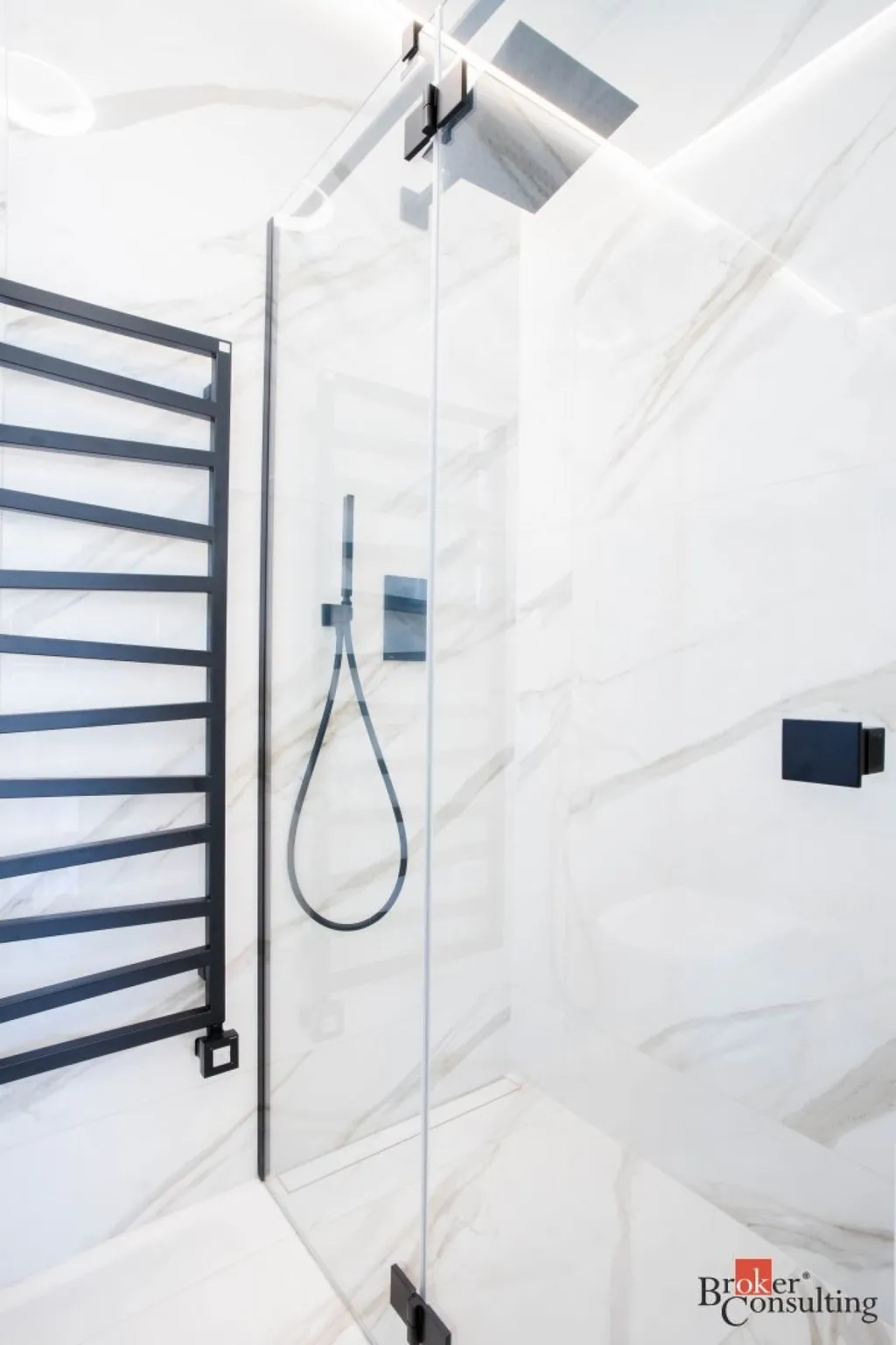 V bytě se nacházejí dvě designové koupelny – jedna vybavená prostornou vanou a toaletou a druhá se sprchovým koutem a taktéž s toaletou. Elegantní chodba s efektním kulatým zrcadlem dotváří luxusní atmosféru celého interiéru a poskytuje dostatek prostoru a úložných možností.