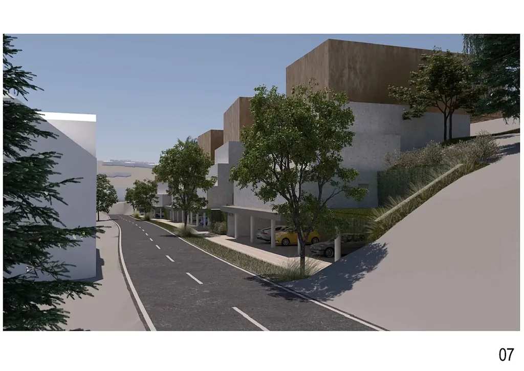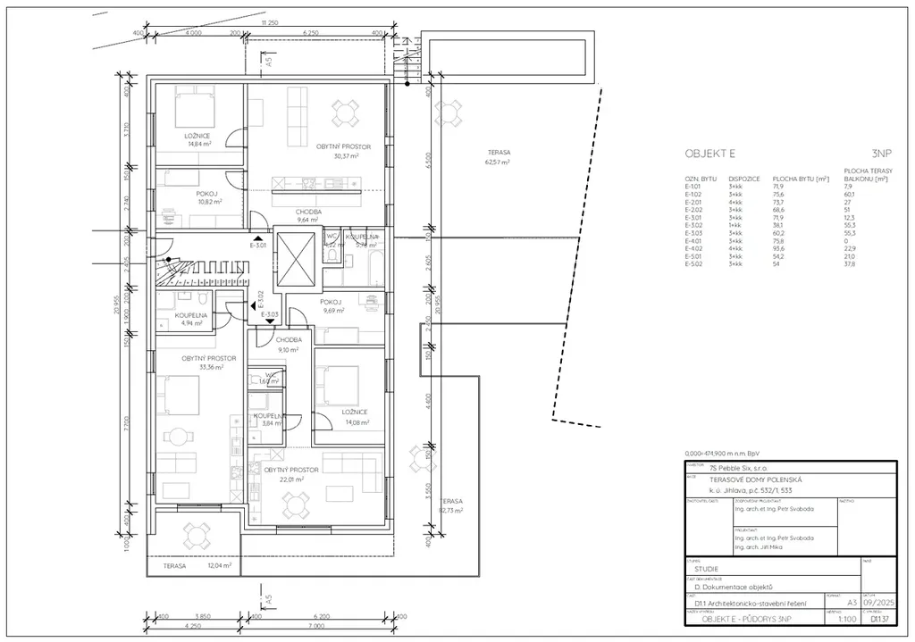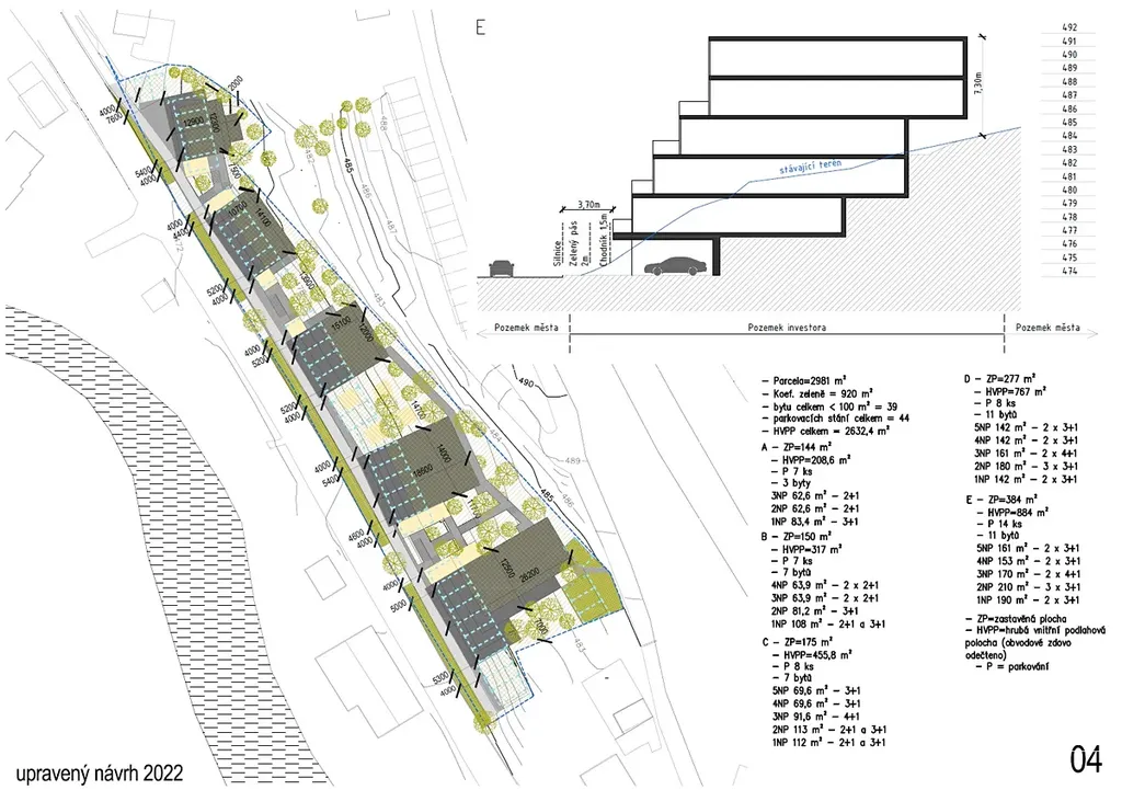 Pozemek na výstavbu 5 bytových domů s cca 39 byty a celkové bytové podlahové ploše cca 2.400 m2 (+ terasy, balkony, sklepy, parkování).