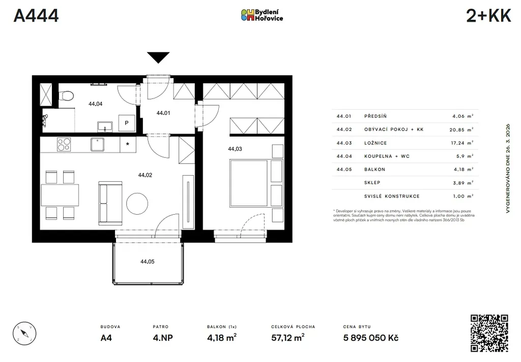Nabízíme k prodeji byt 2+kk č. A444 o celkové ploše 57,12 m2 s balkónem a sklepem. Byt se nachází ve 4. nadzemním podlaží budovy A4 projektu Bydlení Hořovice. Plocha balkonů je 4,18 m2, plocha sklepa je 3,89 m2. Nastěhování léto 2027.