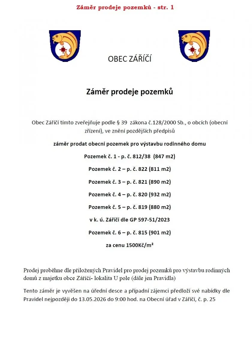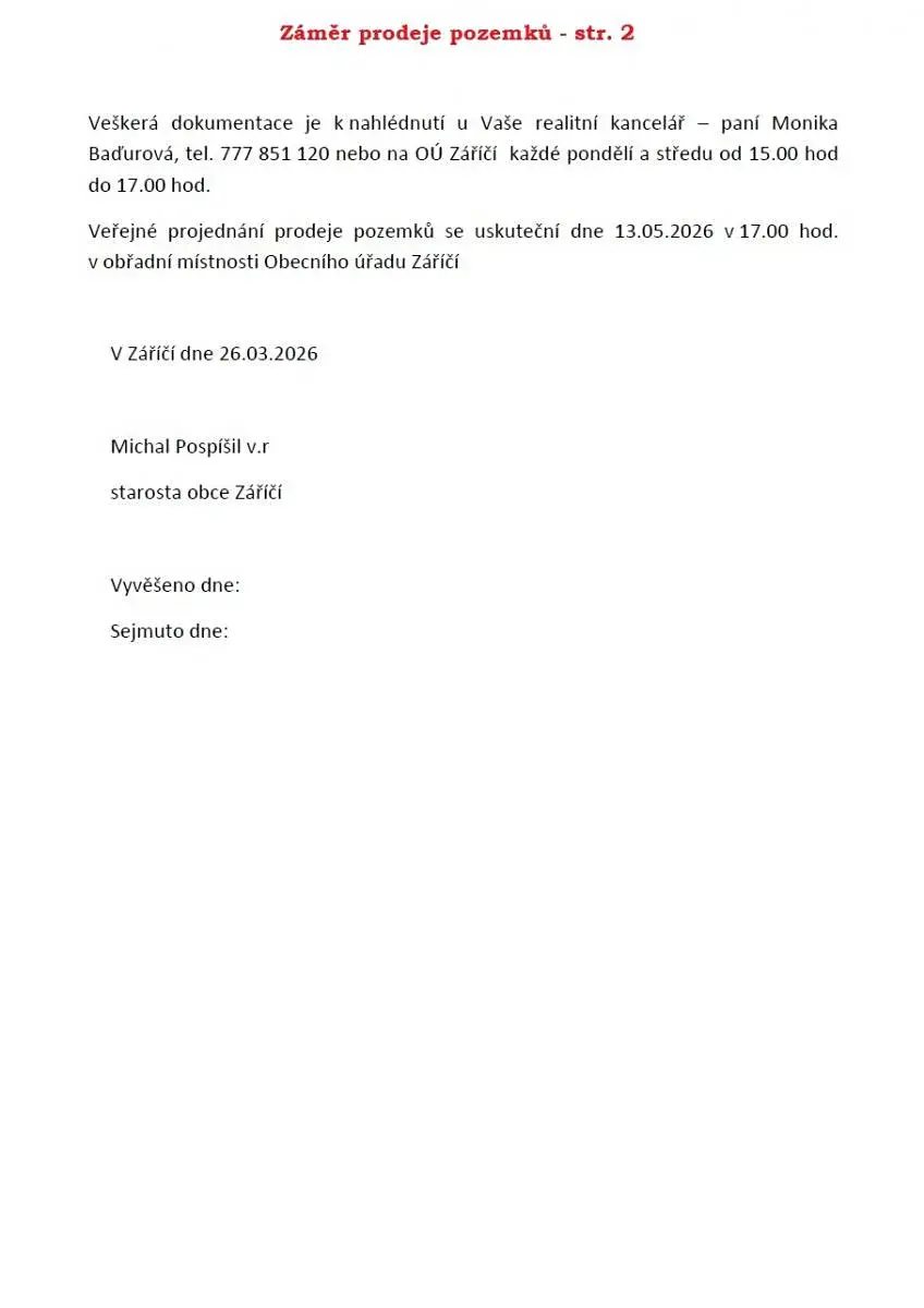 Záměr prodeje pozemků - Obec Záříčí