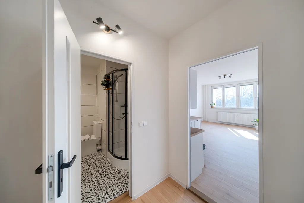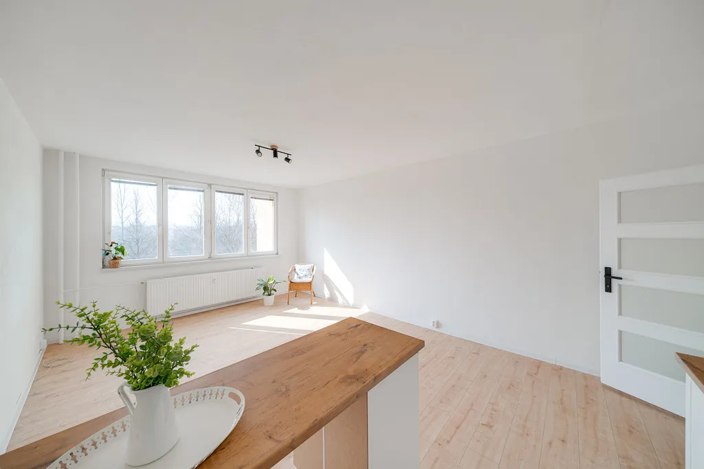 Byt se nachází ve zvýšeném přízemí revitalizovaného panelového domu. Díky provedené rekonstrukci na vás čeká moderní a čistý interiér, který je připraven k okamžitému nastěhování. Srdcem bytu je stylová kuchyň s ostrůvkem, vybavená vestavnou troubou a varnou deskou, která poskytuje velkorysý prostor pro vaření i posezení. Moderní koupelna disponuje sprchovým koutem, praktickou skříňkou a toaletou.