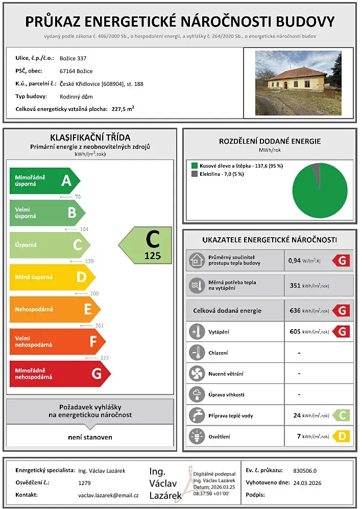Prodej rodinného domu č.p. 337 včetně hospodářských staveb - vše je součástí nově vzniklého pozemku p.č. st. 188 o výměře 2146 m2 (viz. GP č. 714-283/2025). Jedná se o objekt na samotě u silnice II. třídy. Rodinný dům je jednopodlažní, nepodsklepený, se sedlovou střechou. V domě se nachází jedna bytová jednotka s příslušenstvím. Na rodinný dům navazuje uzavřený dvůr, na kterém se nacházejí 4 hospodářské budovy - 2 stodoly a 2 vedlejší stavby. Nemovitost je napojená na elektrickou síť a obecní vodovod, odpad je sveden do septiku.
