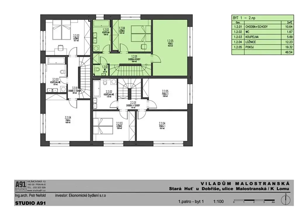 Dispozice bytu nabízí v 1NP prostorný obývací pokoj s kuchyňským koutem o výměře 28m2, schodiště do 2NP, přímý vstup na terasu a zahradu o rozloze 178m2, koupelnu se sprchovým koutem 5m2, komoru 1m2 a vstupní chodbu 5m2. Ve 2NP naleznete 2x pokoj 12m2 a 20m2, samostatnou koupelnu 6m2, samostatné wc 1m2, chodbu 10m2 a schodiště do 3NP, zde naleznete pracovnu 13m2, a 2x půdní prostory plně pochozí o celkové výměře 21m2 s možností vybudování wc s umyvadlem i sprchovým koutem.