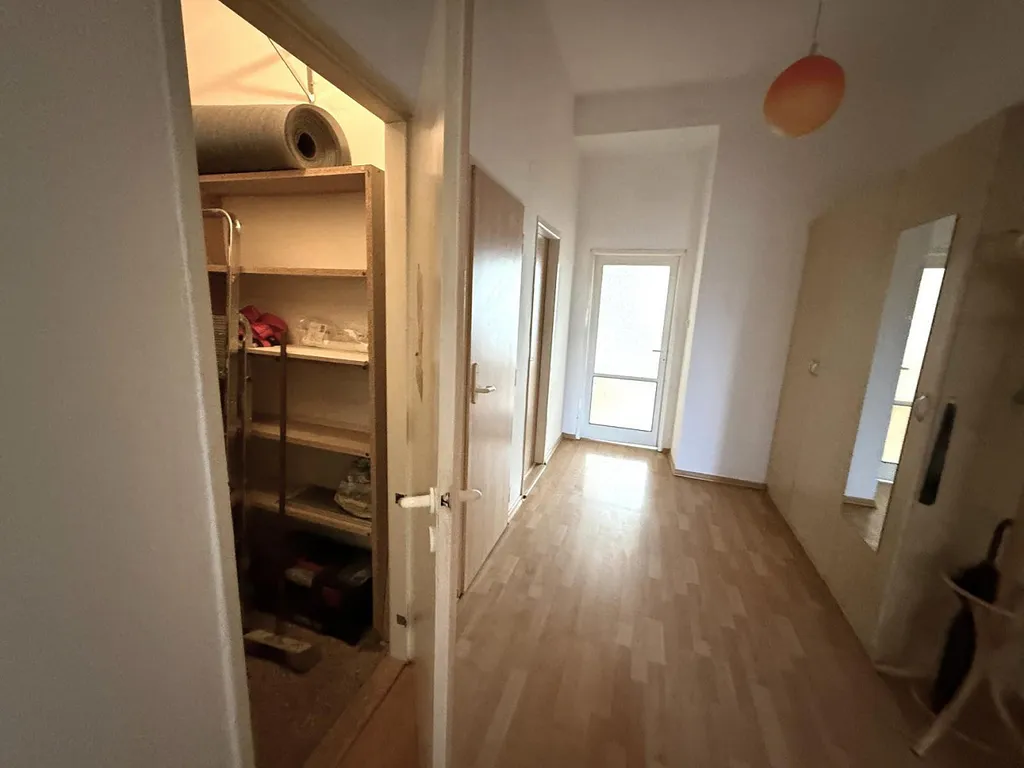Za vstupními dveřmi se ocitneme na velmi prostorné chodbě (cca 10,30 m²), která disponuje prostornou šatní skříní a vstupy do většiny místností. Po levé straně je kuchyně (cca 10,20 m²), která je vybavena lednicí s mrazákem, novou troubou, novým sporákem a myčkou. Kuchyně je orientována na severovýchod. Velmi pěknou místností je obývací pokoj (cca 18,50 m²) se sedačkou a televizním stolkem, kde hlavní dominantou je velmi prostorný balkón (cca 5 m²). Obývací pokoj s balkónem je orientován na východ. Na chodbě se dále nachází spíž (cca 2,50 m²), která je vybavena regálovým systémem pro jednodušší uskladnění věcí, může sloužit i jako šatna. V bytě dále nalezneme samostatnou toaletu o výměře cca 1 m² a koupelnu (cca 3 m²), která disponuje vanou, umyvadlem a zrcadlem. Po pravé straně ze vstupní chodby vcházíme do pokoje o výměře cca 18,60 m², který je vybavený postelí, psacím stolem se židlí a skříněmi, a je orientovaný na jihozápad. Z tohoto prostorného pokoje se vchází do ložnice (cca 12 m²), ve které se nachází velká šatní skříň na míru a dvojlůžko. Ložnice je taktéž orientována na jihozápad.