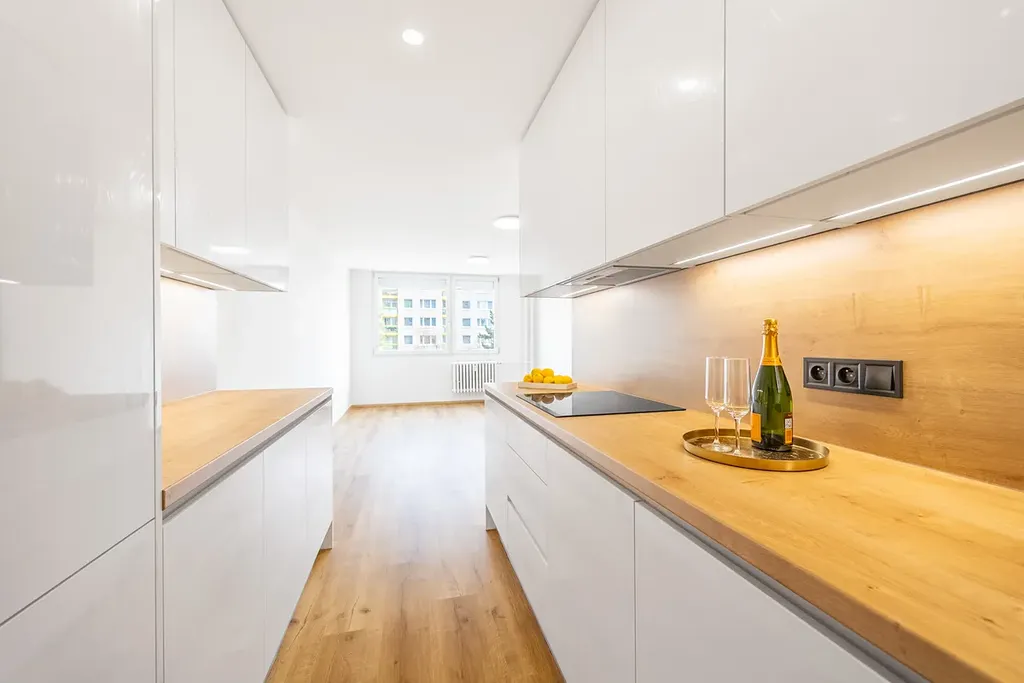- nová kuchyňská linka vyrobena na míru se spotřebiči (značková elektrická trouba, myčka, indukční deska, digestoř, osvětlení, dřez)
