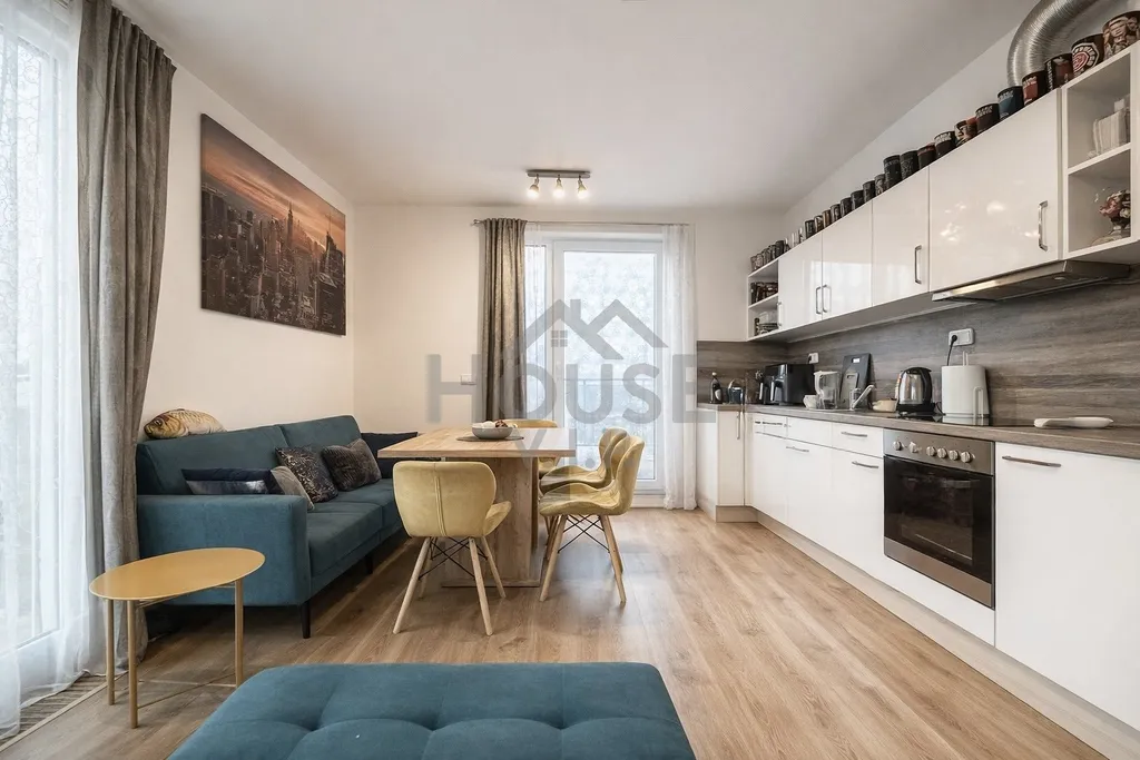 Dispozice bytu zahrnuje předsíň s vestavěnou skříní, pokoj s moderní vybavenou kuchyňskou linkou a vstupem na zahradu, samostatný pokoj s vestavěnou skříní, koupelnu s vanou, toaletou a pračkou. Podlahy tvoří kombinace PVC a dlažby, plastová okna jsou orientována na severozápad. Byt je připravený k okamžitému nastěhování.